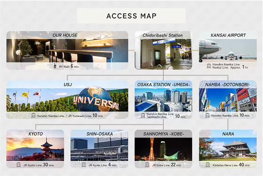 このたび、当社が運営する宿泊事業において、大阪市此花区・千鳥橋エリアにて、新たな民泊施設の提供を開始いたしました。本物件は、2025年5月に全面リノベーションを実施し、外観・内装ともに一新された3階建て・一棟貸切型の宿泊施設です。最寄りの千鳥橋駅から徒歩約5分、大阪難波駅から乗換なしで約10分という好立地に位置し、ユニバーサル・スタジオ・ジャパン(USJ)や大阪駅、また神戸や奈良方面にもアクセス良好な、関西を代表する観光・ビジネス拠点へのアクセスにも優れています。また今話題の大阪万博にも車で20分ほどでアクセス可能です。この機会に是非ご利用ください。